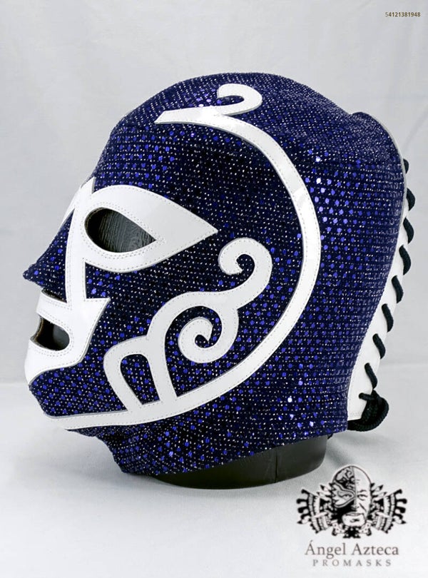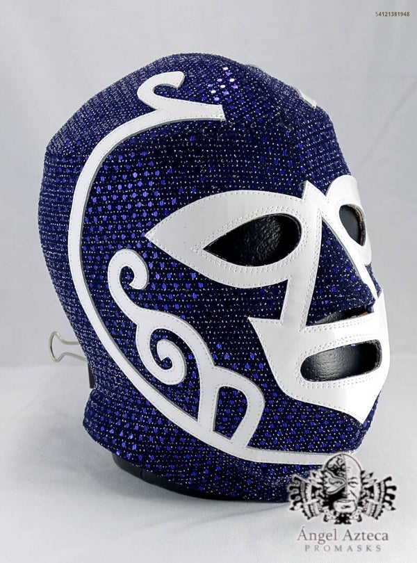 Mascara profesional manufacturada con las medidas originales del luchador en mech con lentejuela con aplicaciones en charol de cuero.