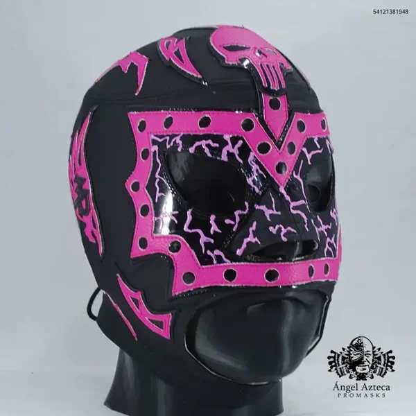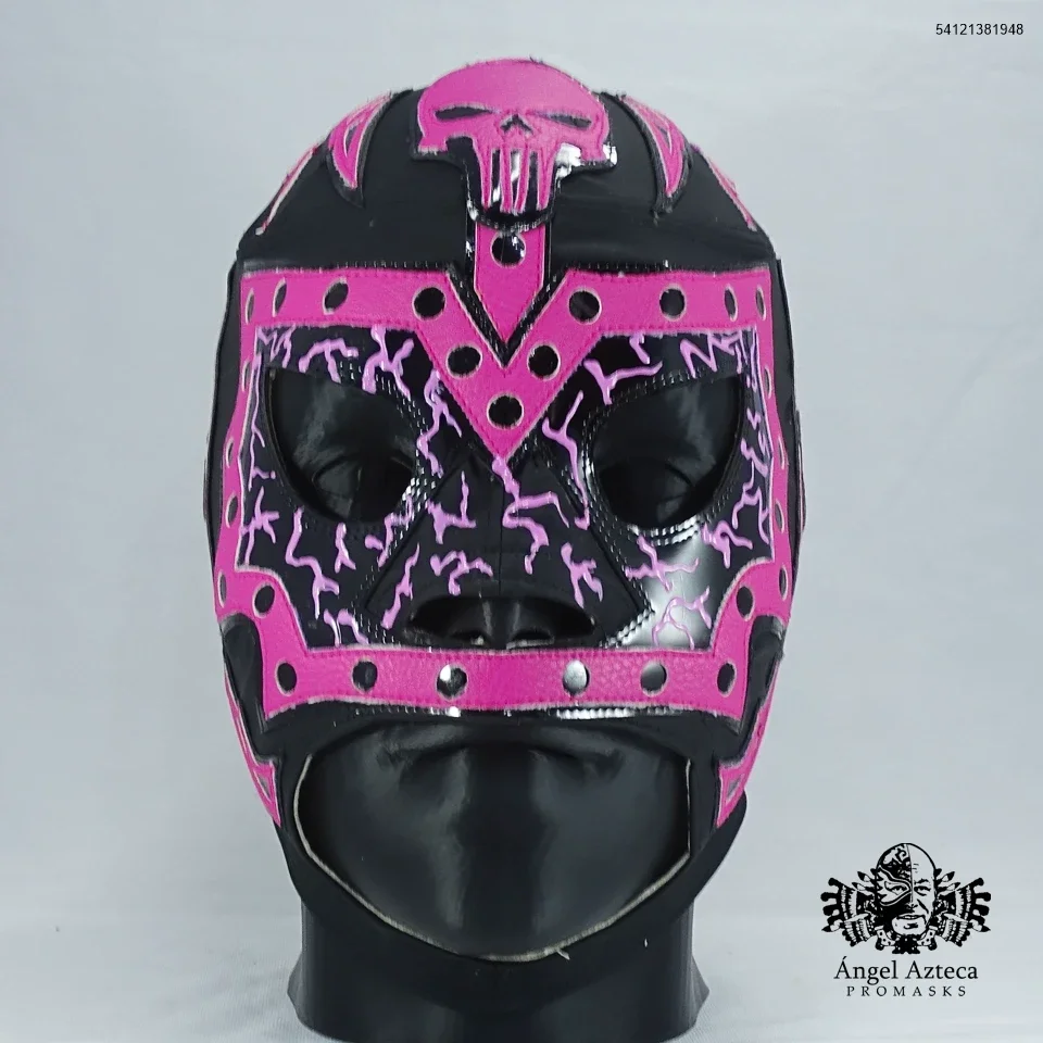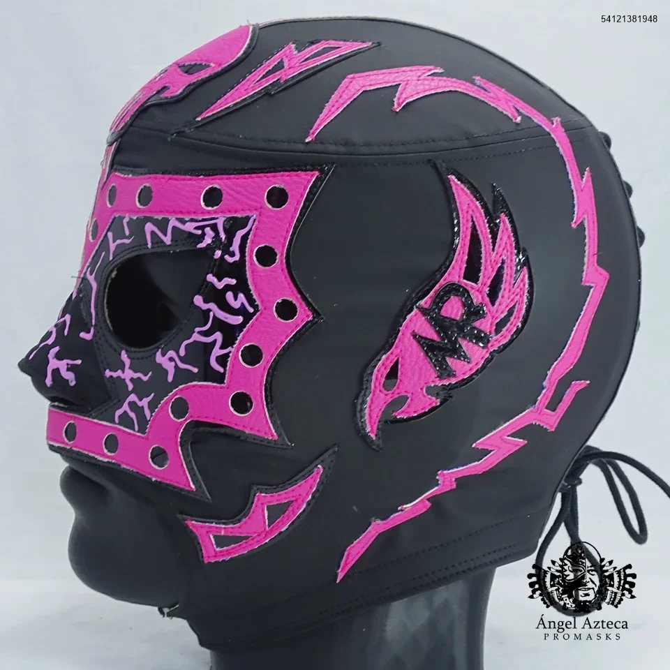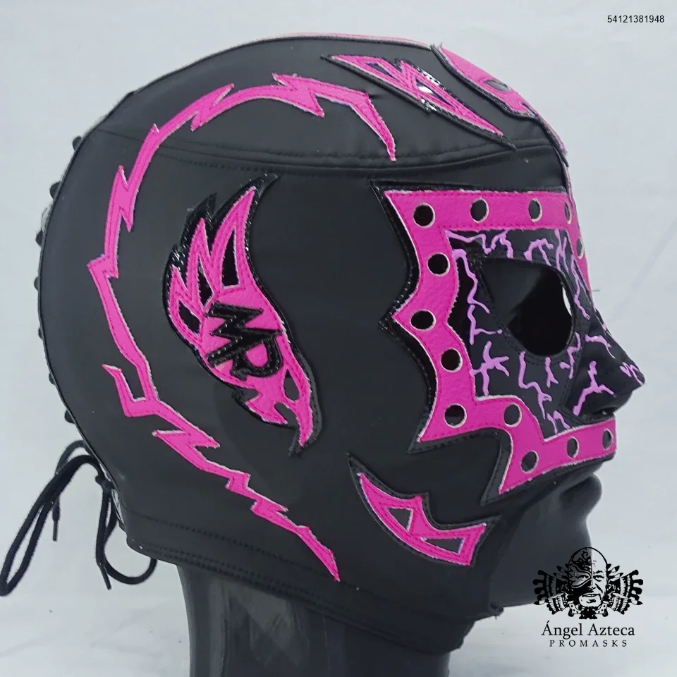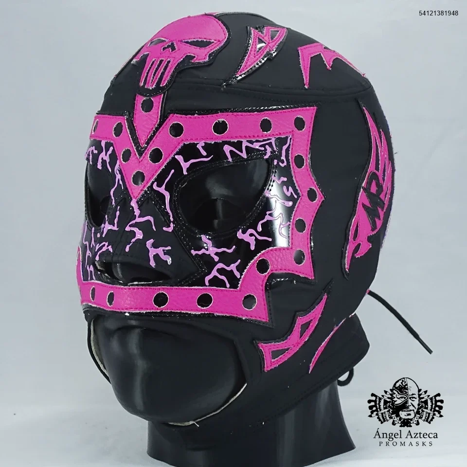 Mascara profesional manufacturada en tactopiel con aplicaciones en policharol negro, polipiel rosa. amarre de agujeta, tamaño estandar grande.